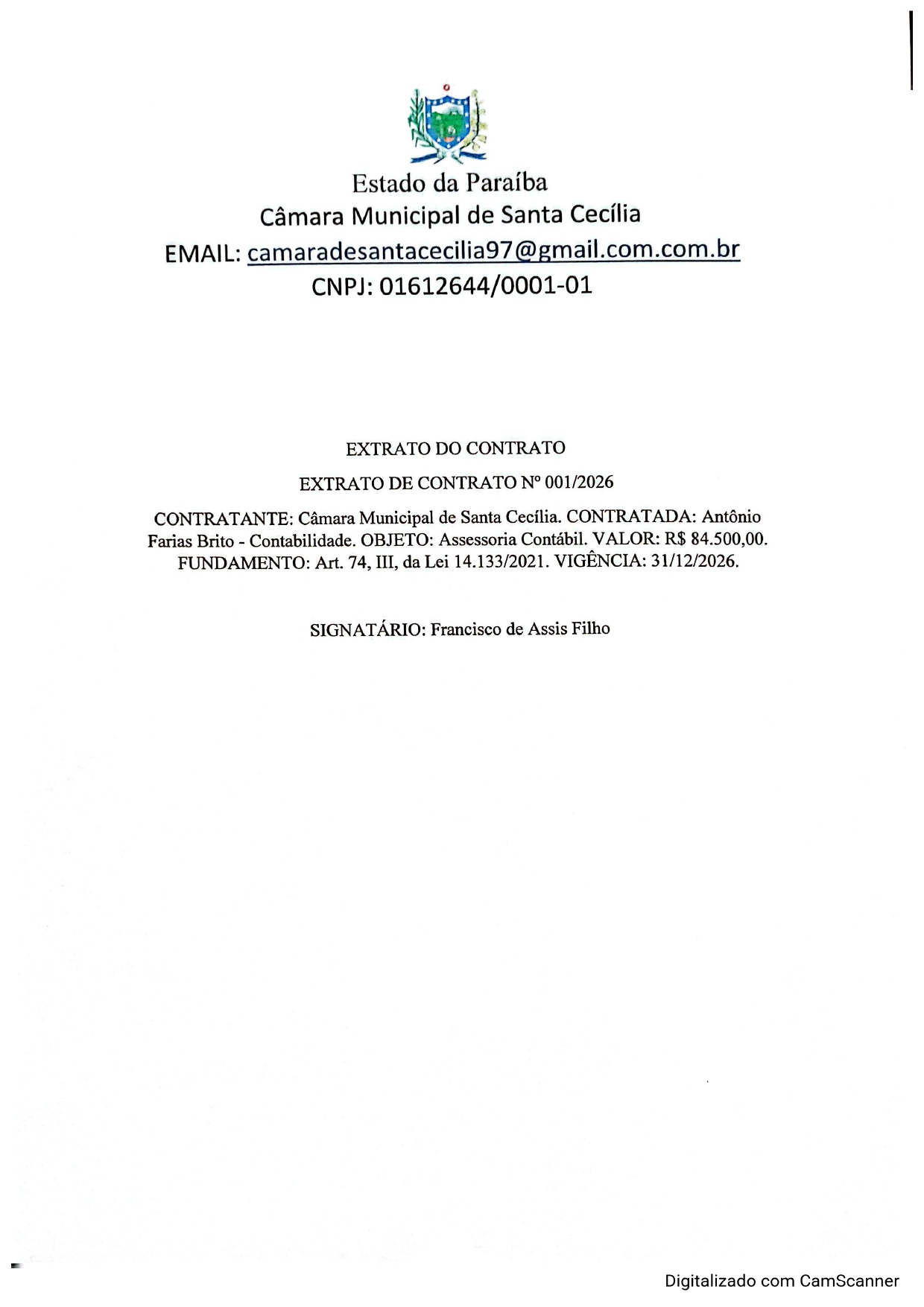 Contrato de Assessoria Contábil para Câmara Municipal de Santa Cecília PB EXERCÍCIO 2026. 19/01/2026 Ler mais